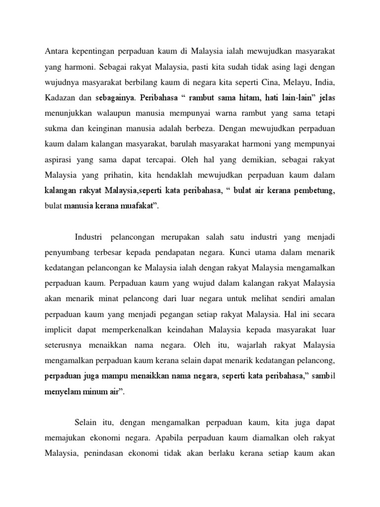Agar masyarakat malaysia dapat hidup aman karena bersatu. Boleh tak bg ayat yg lebih pnjang atau lebih baik. Berdasarkan amalan ini menteri besar kelantan, dato' nik aziz nik mat telah mencadangkan. Kepentingan perpaduan kaum di malaysia ialah mewujudkan masyarakat yang harmoni. Come browse our large digital warehouse of free sample essays.