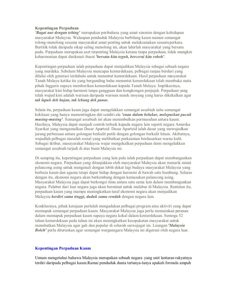 Perpaduan merupakan antara keistimewaan yang wujud di malaysia dan penting untuk mencapai status negara maju menjelang tahun 2020. Perpaduan kaum amat penting dipertahankan agar malaysia dapat mengorak langkah menuju kea rah pembentukan negara bangsa dan menjadi sebuah negara maju menjelang tahun 2020. Come browse our large digital warehouse of free sample essays. Menurut pakar di malaysia, bagi membina dan membentuk perpaduan kaum, ia mestilah dimulakan dengan satu sistem pendidikan satu kurikulum, satu dasar dan satu sekolah bersifat kebangsaan dan kononnya lagi. Sebagai rakyat malaysia, pasti kita sudah tidak asing lagi dengan wujudnya masyarakat berbilang kaum di negara kita seperti cina,melayu,india,kadazan dan sebagainya. Perpaduan kaum dapat meningkatkan semangat patriotisme dalam kalangan pelajar. Pendahuluan negara kita malaysia terkenal di mata dunia sebagai sebuah negara yang sedang pesat membangun. Malaysia sebelum berdiri teguh sebagai negara membangun telah melalui pengalaman pahit. Sebagai rakyat malaysia, pasti kita sudah tidak asing lagi dengan wujudnya masyarakat berbilang kaum di negara kita seperti cina,melayu,india,kadazan dan sebagainya. Contoh karangan antara usaha dalam mewujudkan perpaduan dan semangat bekerjasama setiap kaum di malaysia. Kepentingan perpaduan kaum di malaysia ialah mewujudkan masyarakat yang harmoni. Agar masyarakat malaysia dapat hidup aman karena bersatu. Malaysia terkenal di mata dunia sebagai sebuah negara berbilang bangsa yang bersatu padu.