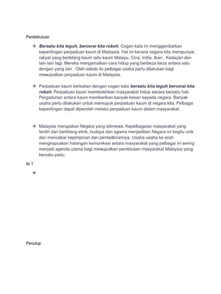 Langkah Mewujudkan Perpaduan Kaum Docx Document from static.fdokumen.site Perpaduan adalah visi atau sasaran utama yang perlu dicapai dan hari malaysia akan disambut esok. Asas integrasi dan perpaduan nasional di malaysia pada zaman penjajahan british, pengasingan kaum sangat ketara. Come browse our large digital warehouse of free sample essays. Maksud perpaduan negara dan kesejahteraan sosial menurut kaca mata datuk. Perpaduan merupakan antara keistimewaan yang wujud di malaysia dan penting untuk mencapai status negara maju menjelang tahun 2020. Sejarah kemerdekaan malaysia these pictures of this page are about:maksud perpaduan Maksud perpaduan dan integrasi perpaduan ialah suatu proses penyatuan daripada semua aspek seperti fizikal, sosial, ekonomi dan politik. Agar masyarakat malaysia dapat hidup aman karena bersatu.